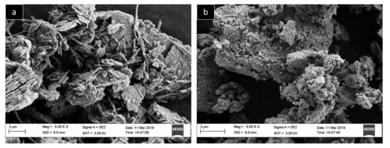 The formation of needle-shaped particles was more pronounced in samples cured at 60 °C, compared with samples cured at lower temperatures. The needle-shaped particles represent a small particle size, as observed at 60 °C, indicating that a smaller particle size leads to a larger surface area and a finer grade of porosity between the particles, as shown in Figure 10. The larger surface area contributed to the high reactivity of geopolymerization indicated by the high compression strength obtained after sintering. The morphology of “needles” and “broken flakes” represent the randomly ordered crystals of kaolinite due to dehydroxylation. The disordered structure represents the huge reactive potential during geopolymerization. The formation of pores was also observed at 80 °C after curing.