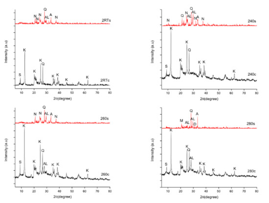 Albite phases occurred in samples after curing at 60 and 80 °C. This transformation is due to the presence of a high alkalinity solution (NaOH, 8 M), which activates the compound crystalline structure and leads to a straightforward chemical reaction between different oxides to form new phases. According to Mierzwiński et al. (2019), in the synthesis of geopolymers, the final properties are influenced by both the amorphous metakaolin phase and the residual kaolin content [7]. Higher phases of kaolin content adversely affect the mechanical strength of the geopolymer.