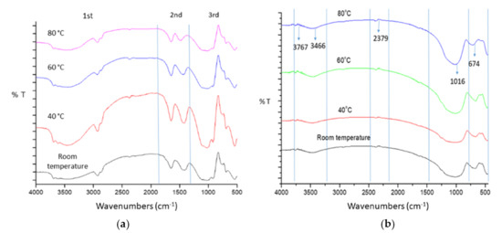 The degree of crystallinity of quartz (SiO2) from GGBS at 20 to 28° had increased after 14 days of curing, indicating the reaction between kaolin and GGBS during geopolymerization. The addition of GGBS, with its disordered structure, had accelerated the combination reactions, leading to the formation of the geopolymer. When kaolinite is heated, the adsorbed water is liberated at above 100 °C, and the weakest part of the chemical bond is broken. Then, dehydroxylation takes place at 450–600 °C. For kaolinite, dehydroxylation might result in the disturbance of the Al(O,OH)6 octahedral sheet by the outer hydroxyl groups, but does not have much effect on the SiO4 tetrahedral sheet due to the more stable inner hydroxyl groups.
