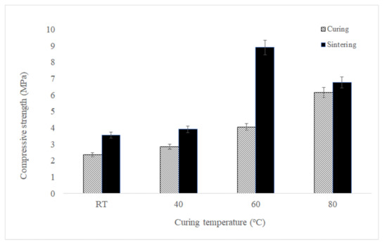 Curing at a higher temperature does seem to influence the development of compressive strength in a positive way. However, when the geopolymer was subjected to the sintering process, 60 °C was found to be the optimum curing temperature resulting in the highest strength. It is interesting to note, that curing at a higher temperature (80 °C) appears to weaken the compressive strength after sintering the geopolymer. It is believed that the sintering mechanism broke-down the structure of the geopolymer, resulting in dehydration and massively interconnected pores.