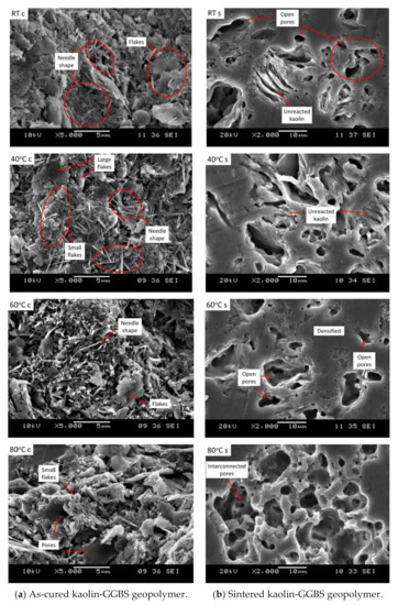 Images of the microstructure of the samples, taken after curing for 14 days and sintering at 900 °C, are shown in Figure 9. There were needle-shaped formations in the microstructure of as-cured kaolin-GGBS geopolymer samples of: Room temperature, 40 and 60 °C. However, the needle-shaped formations were not found in the microstructure of the 80 °C sample following curing. The effect of sintering can be seen from the changes of microstructure in (b) after sintering at 900 °C. Generally, the kaolin-GGBS geopolymer was densified after sintering, along with the formation of pores.