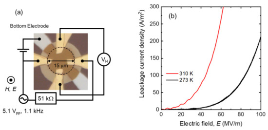 Magnetic characterizations were carried out mainly by means of the AHE measurements after applying the ME field. For the AHE measurements, the film was patterned into the microdot with 15 μm diameter. On top of the microdot, the four top electrode (Cr/Au) was prepared by the lift-off technique. The optical microscope image with the electrical circuit is shown in Figure 3a. In our sample structure, the current flows in the Pt/Co/Au layer wherein the AHE detects the Co magnetization perpendicular to the film plane. This is suitable in this work because the studied film has the perpendicular magnetic anisotropy. In this work, the AHE loops were measured as a function of H applied to the direction perpendicular to the film. From the AHE loop, the exchange bias field, Hex, a shift of the magnetization curve along the H axis was evaluated. Hex was estimated as ∆HC/2 where HC is the switching field (coercivity) for up-to-down and down-to-up switching of the FM magnetization. E was applied between top (Pt/Co/Au) and bottom (Pt-buffer layer) electrodes, i.e., the direction perpendicular to film. The positive directions of H and E are defined as the direction from bottom (substrate side) to top (film side) of the film.