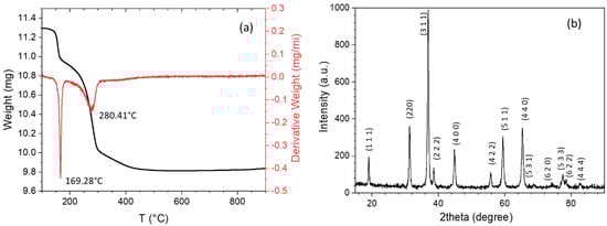(a) Thermogravimetric curve and its derivative of the dried Co(OH)2 precipitate, and (b) XRD pattern of the sample calcined at 300 °C in air (the Bragg reflections are labeled according to Co3O4, PDF card No. 01-080-1545).