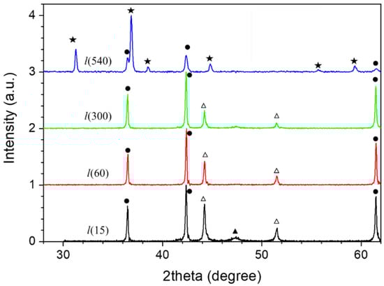 XRD patterns of l-series for various oxidation times. The symbols next to different reflections indicate their assigned phases: (●) CoO (00-048-1719 PDF card No.), (★) Co3O4 (01-080-1542 PDF card No.), (△) cubic Co (00-015-0806 PDF card No.), and (▲) hexagonal Co (00-005-0727 PDF card No.).