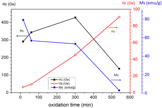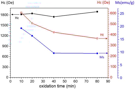 Low-temperature hysteresis loops of the l-series samples are shown in Figure 3. As expected, the saturation magnetization, MS, is drastically reduced upon oxidation, evidencing the progressive growth of a Co-oxide shell at the expense of the Co core. All loops exhibit horizontal shifts (EB fields), indicating the exchange coupling between Co cores and Co-oxide shells. The variation of saturation magnetization (MS), HE and coercivity (HC) with oxidation time is presented in Figure 4. The normalization of the measured MS (after subtracting high-field linear contributions) by the bulk magnetization of cobalt, MS,bulk = 160 emu/g, gives an estimate of the Co and Co-oxide weight fractions in each sample. These values are shown in the last two columns of Table 1. Although they compare reasonably well with the Co and Co-oxide fractions obtained from the XRD fits, the values obtained by magnetometery show systematically higher Co fractions. This could be attributed to an FM-like contribution in the mostly AFM Co-oxide phases due to crystalline disorder or size effects, as reported previously for different AFM nanostructures [37,38,39,40,41]. For the most oxidized sample, l(540), magnetometery proves far more sensitive than XRD to detect the presence of a residual (2%) amount of metallic Co.