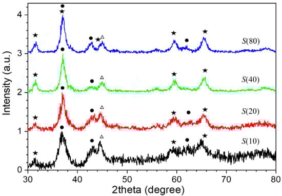 In the above series, the metallic Co regions (excluding perhaps a certain fraction in l(540)) were too large to yield strong EB fields. Next, the results corresponding to the s-series are presented, beginning with the XRD patterns in Figure 6, where, again, growing fractions of CoO and Co3O4, at the expense of cubic Co, upon oxidation are observed. However, a fraction of metallic nanocrystalline Co remains after oxidation for 80 min. In fact, samples s(40) and s(80) present very similar patterns, suggesting an effective passivation of the system after 40 min. As expected, crystallinity improves with longer thermal treatment. The fractions of the Co-oxide shell and Co core were estimated using the program MAUD and are presented in Table 2.