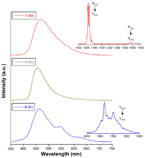 - Bi, Y.; Chen, C.; Zhao, Y.-F.; Zhang, Y.-Q.; Jiang, S.-D.; Wang, B.-W.; Han, J.-B.; Sun, J.-L.; Bian, Z.-Q.; Wang, Z.-M.; et al. Thermostability and photoluminescence of Dy(iii) single-molecule magnets under a magnetic field. Chem. Sci. 2016, 7, 5020–5031. [Google Scholar] [CrossRef]