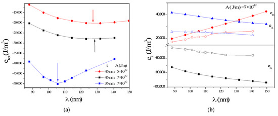 (a) Variation of the total energy density as a function of the stripe domain wavelength for a 45 nm thick (red and black) and 35 nm thick (blue) NdCo5; (b) energy density contributions for 45 nm thick (full dots) and 35 nm thick (empty squares) NdCo5 films. The exchange is kept constant for (b). No external magnetic field is considered.