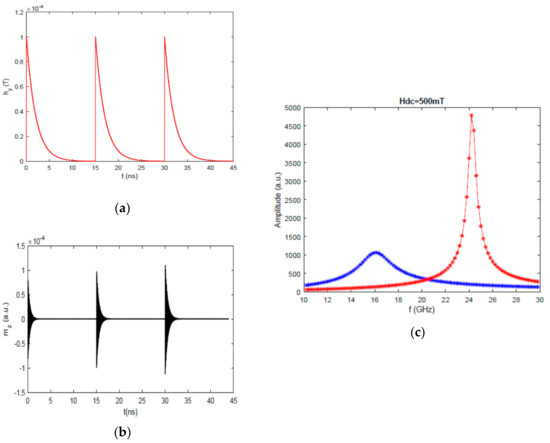We will only focus on the case where HDC is applied along the NdCox in-plane hard axis: experimentally, the biggest effects have been found for this particular case [36]. Following the procedure reported in the methods section, we keep the magnetic system under linear response by applying a low amplitude hpulse: 1mT. The hpulse temporal variation follows a decreasing exponential to sample a broad frequency range with a unique numerical experiment (see Figure 5a). The temporal magnetic response (mz) is followed for 15 ns. In Figure 5b we can see mz(t) for three HDC values of decreasing amplitude. The obtained mz(t) is interpolated to values at regularly spaced times with Matlab© (this step must be done due to the fact that MuMax3 uses a variable time step procedure for the integration of the magnetization equations of motion). The interpolated mz(t) is then Fourier transformed to find the amplitudes in Fourier space. Figure 5c presents the corresponding amplitudes of Permalloy (red) and NdCo5 (blue), normalized to the spectral for the amplitude of hpulse, for the HDC = 50nm case.