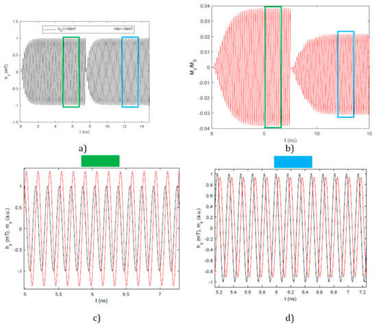 We performed another kind of analysis of the hysteretic behavior of the fres vs. HDC curves. We excited the whole film with a sinusoidal hAC field of amplitude 1mT (Figure 7a). The individual FMR of each state was accounted for in hAC. Along Figure 7, the results marked with a green (blue) color belongs to the descending-HDC (ascending-HDC) state under HDC = 50 mT. Even if the whole temporal evolution is saved (Figure 7b), we just analyzed the stationary range inside the colored rectangles (Figure 7c,d). The temporal evolution of the average Permalloy magnetization (red curves) along hAC (black curves) for these two states results in two different elliptical motions of mx at each FMR. The ellipses are the combined result of a sinusoidal my(t) with a different amplitude and different phase relative to hAC(t). The ascending-HDC state has an elliptical motion of lower amplitude and lower my-hAC dephasing. These two facts confirm the interpretation given above: the ascending-HDC state has the lowest internal field amplitude.