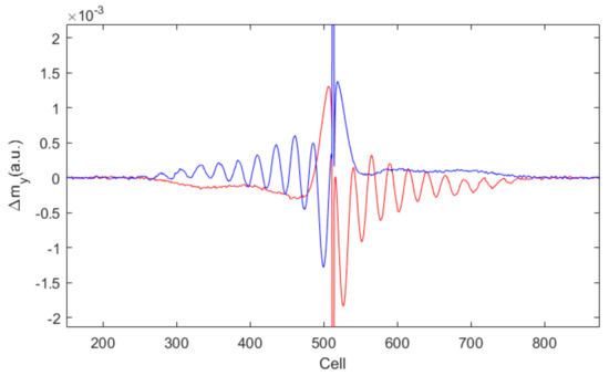 The numerical experiment has been done again on the NdCox-(10nm-Al)-Py trilayer using only its remanent state. The spin wave motion has been performed by applying hAC only locally (see Method section). Figure 8 shows the obtained results for a hAC frequency equal to 2.5 GHz. A temporal snapshot of Δmy is presented: the difference between the reduced magnetization parallel to hAC, my(τ), and its equilibrium value my(τ = 0). Figure 8 give us two characteristics of the excited spin waves: (i) spin waves mainly propagate along one sense , for a given domain (along the other sense, −, spin waves are highly damped); (ii) the allowed are antiparallel in two neighboring domains (when the blue curve represents the guided spin waves along , the red curve represents spin waves along −). When analyzing the distributions of mx and Δmx it can be stated that the allowed spin waves excited by the local hAC at a given domain obey the following law: = × [40]. Here, denotes the film normal and the reduced magnetization of the Permalloy domains. The spin wavelength reported in Figure 8, λSW, is close to 122 nm for both Permalloy domains. The wavevector is parallel to the previously applied field HDC (which at the same time sets the stripe domain/spin wave channel direction) and its module is 51 rad×μm−1. The imaging of the spin waves at this spatial scale can be reached with X-ray techniques as recently demonstrated [41].
