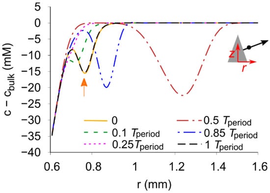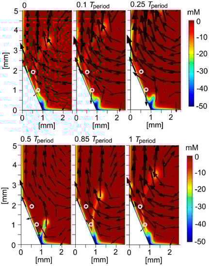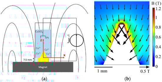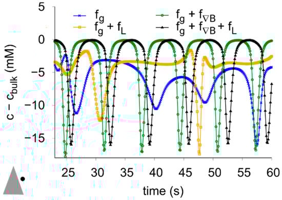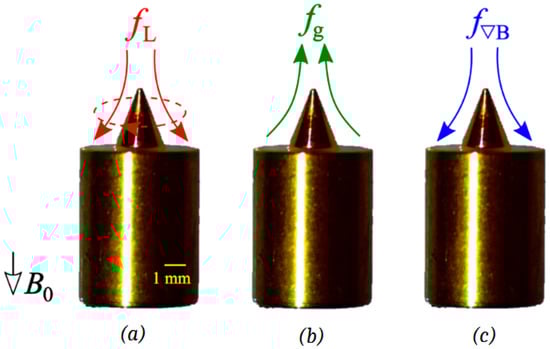 . As defined by Equation (3), the magnetic gradient force is strongly related to the concentration distribution of metal ions near the cone. Therefore, as the deposition proceeds, the magnitude and direction of the flow caused by the magnetic gradient force can change dynamically as the concentration boundary layer develops. A schematic view of the flow caused by each volume force is shown in