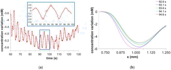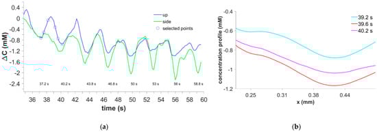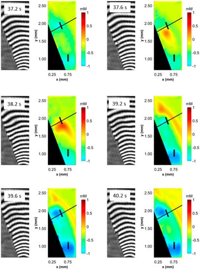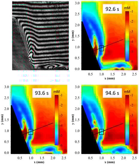 The accuracy of the concentration data obtained by the measurements with the Mach Zehnder interferometer and the subsequent calculations is subject to small uncertainties resulting from Joule heating of the electrolyte during the electrolysis, additional species existing in the solution, and the algorithm of the wavelet transformation itself. An exact error is difficult to estimate under these conditions. However, earlier works [