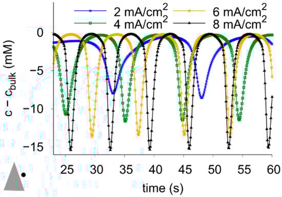 In order to provide more detailed information on the flow and mass transfer during the deposition, numerical simulations were performed for galvanostatic deposition with an averaged cathode current density ranging between 2 and 8 mA/cm