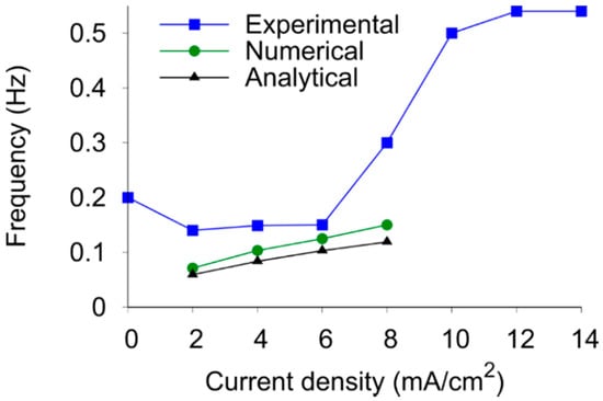 One point worth mentioning is that in general the oscillation frequency shows an increasing trend when the current density is enhanced, which is caused by a faster decrease in the concentration on the cathode, as confirmed by both numerical and theoretical analysis. At higher current densities (8 mA/cm2), the oscillation frequency rapidly increases to values much larger than in the numerical and theoretical results. This is related to hydrogen evolution, which was only observed in the experiments at such high current densities and was not accounted for in the numerical and theoretical studies.