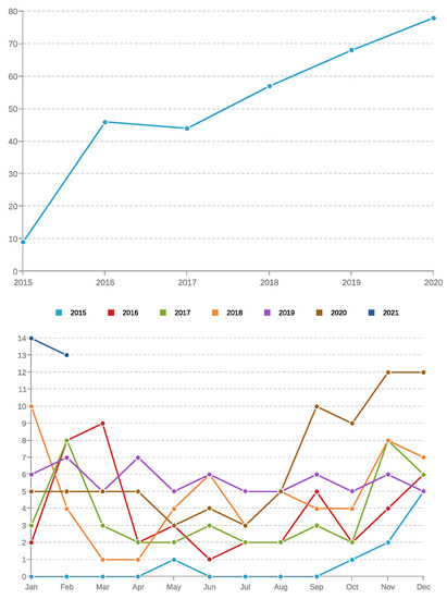 Yearly (above) and monthly (below) published articles in Magnetochemistry.