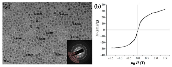 The thermal decomposition method was used, as it offers the best control over the particle size and yields monodispersed NPs [16]. The synthesized OA/OLA-coated IO NPs were 4.5 ± 1 nm in diameter, as confirmed by the transmission electron microscopy (TEM) analysis (Figure 1a). The acquired selected area diffraction pattern (SAED) was compared to the calculated diffraction pattern (ICSD 65340), which confirmed the cubic inverse spinel crystal structure of IO NPs (Figure 1a, inset). The superparamagnetic nature of the OA/OLA-coated IO NPs was confirmed with the magnetic measurement (Figure 1b). The saturation magnetization of 32 emu/g is the expected value for 5 nm γ-Fe2O3 NPs [24].