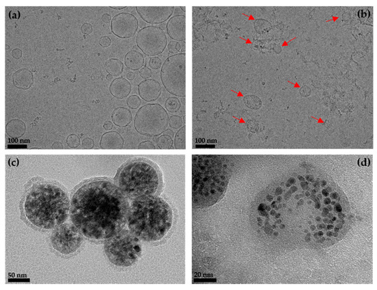The morphological investigation of the samples was conducted using TEM. Cryo-TEM images of empty liposomes and empty EMVs are shown in Figure 2a,b, respectively. Empty liposomes are unilamellar with a spherical shape [30]. Interestingly, the size distribution is wider (50–200 nm) than expected from the DLS measurements. The empty EMVs consist of intact unilamellar spheres/discs (red arrows) and fragments of membranes. The observed complex nature of the sample is reflected in the large particle size determined with DLS analysis (>300 nm). DLS yields the particles size (hydrodynamic diameter) assuming discrete and noninteracting particles, while TEM sample preparation can induce artefacts; therefore, combining different methods to elucidate the nanoparticles’ size and morphology is crucial. In the case of magneto-liposomes (Figure 2c) and magneto-EMVs (Figure 2d), clusters of IO NPs are coated with approximately 5 nm layer of phospholipids or erythrocyte membranes, respectively, with a size range from 30 nm up to 80 nm for the individual magnetic nanostructure. Again, particle size determined via TEM analysis differs from the DLS values due to the above-mentioned reasons. Hydrophobic NPs are expected to be embedded in the bilayer/membrane and not in the nanocarriers’ core, as was observed in our case. However, for this to occur, the choice of the surface ligands that facilitate the inclusion in the bilayer must be considered along with the NPs size limitation (approx. 5 nm). Our observation can be attributed to the fact that OLA/OA ligands hinder the inclusion of NPs into the bilayer due to the kink in the chain at the site of the double bond, thus forming micelle-like structures with aggregates that are coated with a lipid layer [31] (Figure 2c). On the contrary, when OA/OLA are replaced with a ligand such as nitrodopamine palmitate (no double bond in the chain and higher affinity toward the IO surface, which improves stabilization and maintains the spacing between individual NPs), liposomes with IO NPs, embedded in the bilayer, can be prepared [12,31]. Importantly, the size of the magnetic clusters coated with a lipid bilayer/membrane (Figure 2c,d, respectively) is in both cases comparable, which is crucial for the reliable comparison of MRI contrast efficacy.