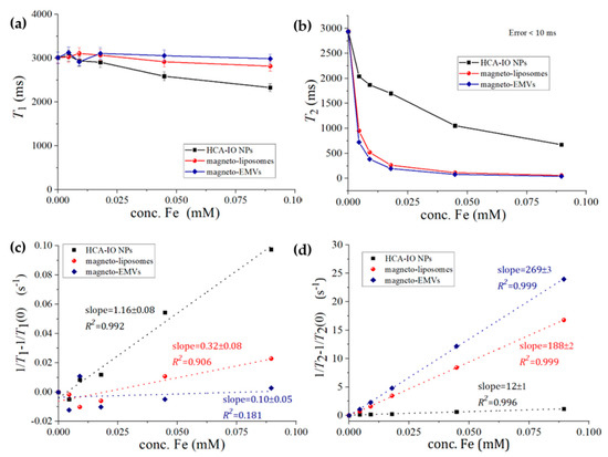 (a) T1 and (b) T2 relaxation times of hydrophilic HCA-coated IO NPs, magneto-liposomes and magneto-EMVs with the corresponding (c) inverse longitudinal 1/T1–1/T1(0) and (d) inverse transverse 1/T2–1/T2(0) relaxation rate increase, where T1(0) and T2(0) represent the T1 and T1 relaxation times for water containing no particles.