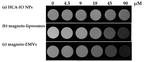T2–weighted MRI images of (a) hydrophilic HCA-coated IO NPs, (b) magneto-liposomes and (c) magneto-EMVs, containing different concentrations of Fe (0–90 μM = 0–5 μg/mL).