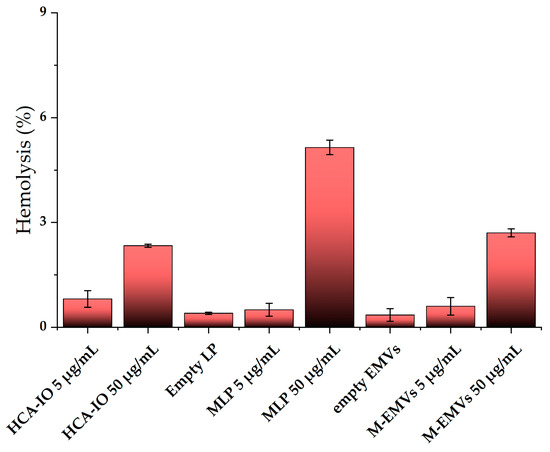 The determined phospholipid concentration was 4.5 ± 0.3 mM and 0.5 ± 0.2 mM for empty liposomes and empty EMVs, respectively. The initial total phospholipid concentration used for the preparation of liposomes was 5 mM, and, therefore, a decrease in the final sample can be attributed to the losses during the sample preparation, especially during extrusion, where some material can be lost on the filter membranes. The phospholipid concentration in the empty EMVs was found to be 0.5 ± 0.2 mM, which agrees with the literature, where, for 0.5 mL of erythrocytes, the phospholipid content was determined to be 0.31 ± 0.03 mM [29]. In our case, we used 0.6 mL of erythrocytes (3 mL containing 20 vol.% of erythrocytes) for the preparation of EMVs; therefore, the measured values are accordingly higher. Importantly, the phospholipids represent only approx. 55% of the membrane structure, and therefore the total membrane mass in the sample is higher; the rest are cholesterol (30%), glycolipids (10%) and proteins [22,23]. Furthermore, the ICP-MS analysis showed that the Fe content in the magneto-liposomes was 8.2 times higher (5.32 ± 0.08 μg/mL) than in the magneto-EMVs (0.65 ± 0.05 μg/mL) due to the higher initial IO NPs used (phospholipid content in liposomes was 9 times higher than in the used EMVs). Therefore, the Fe-phospholipid ratio is comparable in both samples, which is of vital importance for the following tests: hemolysis assay and MRI experiments. All samples there were normalized to the same Fe content.