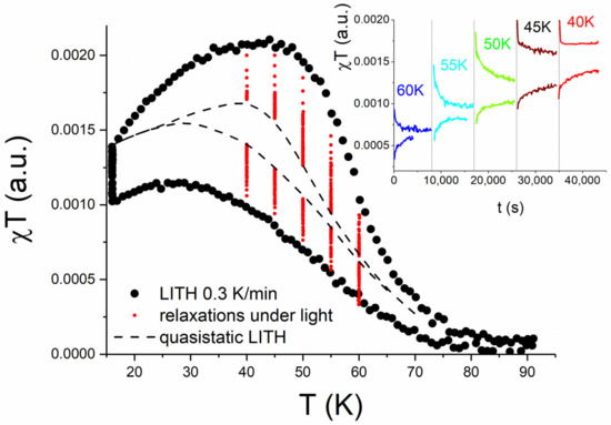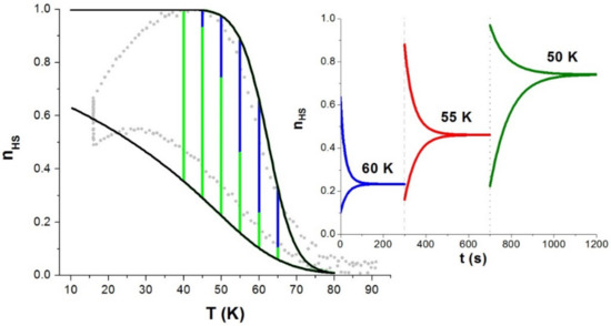 - Varret, F.; Boukheddaden, K.; Codjovi, E.; Enachescu, C.; Linares, J. On the competition between relaxation and photoexcitations in spin crossover solids under continuous irradiation, in: Spin crossover in transition metal compounds II. Top. Curr. Chem. 2004, 234, 199–229. [Google Scholar] [CrossRef]