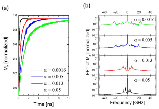 Damping coefficient dependence of z-axis transmission, where 3 GHz RF signal is used for the excitations. The effect of increasing Gilbert damping coefficient on transient Mz in (a) time and (b) frequency (for 8–10 ns time window) domains (the rest of the parameters were fixed). The nanogratings with lower damping coefficients transmit higher-frequency oscillations with higher transmission ratios.