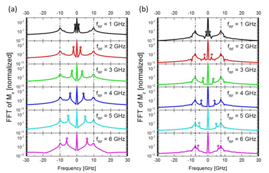 The RF excitation signal which is applied along the longitudinal axis of the nanowire has a significant contribution to the spectral features and modes of the nanograting filter response, as shown in Figure 3. The Mx spectra in Figure 3a show the different excitation frequency peaks of the RF signal along the longitudinal direction. The first neighbors around the zero-bias peak signed with star labels are an indication of the excitation frequency. A higher frequency excited peak (at around 10 GHz) at each spectrum curve appears unaffected by the increasing excitation frequency, which may imply that the magnetization response along this magnetization component does not affect higher frequency modes resulting from spin-wave generation in the nanowire. In Figure 3b of the Mz spectra, the excited modes’ intensities also experience an increase with the higher frequencies of the excitation signal, while a 7.5 GHz excited peak appearing for the same nanowire geometry and material settings is clearly unaffected by this change. This shows a possible frequency-selective property of the nanowire structure prone to any change in an applied RF signal frequency.
