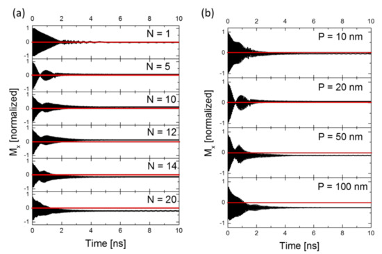 The effect of increasing the (a) periodicity N and (b) period P of the nanograting structure on Mx temporal plots. Other geometry parameters are fixed. Material parameters; α = 0.013 and Ms = 840 × 103 A m−1. Excitation frequency is 3 GHz with 500 mT RF and 1000 mT DC bias field.