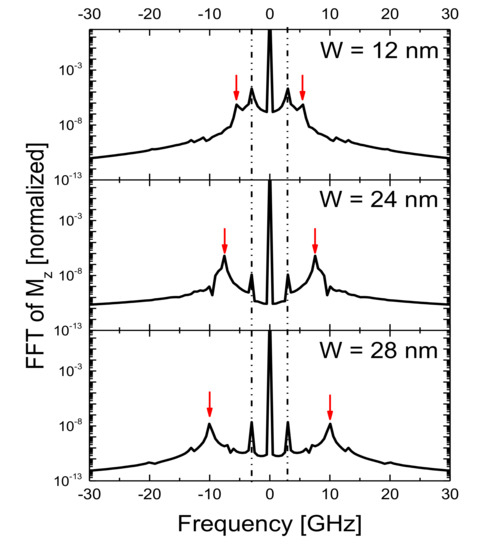 Another way to relate the output spectrum of the nanowire to the selectively produced mode is to cause W to become narrower or wider, within the given structure width. This is demonstrated in Figure 5, where spectral peaks are shifted to higher frequencies as W increases. Since the MC is excited at DC (0 Hz) and 3 GHz, these driving forces appear as steady-state peaks in all spectra. The major peaks other than 0 Hz and 3 GHz are attributed to the demagnetizing field-driven effects. Figure 5 shows that increasing the width W from 12 to 28 nm shifts the high frequency peak from 5 to 10 GHz.