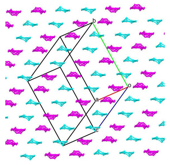 Conducting BEDT-TTF radical cation layers of salts 1–5 packed by β″-type. Crystallographically unique BEDT-TTF radical cations are denoted by color. Molecule A is colored magenta, B is colored cyan. AABBAABB packing arrangement for BEDT-TTF stacks and chains is shown.