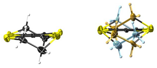 An average charge on the BEDT-TTF is +1/2 obtained from the charge balance requirements. In the salt 5, the radical cation A is completely ordered, both terminal ethylene groups of the radical cation B are disordered over two positions with the occupancies of main positions of 0.61 (atoms C17, C18) and 0.74 (atoms C19, C20) for each terminal correspondingly, Figure S1. Minor positions are complementary to the main positions with the occupancies of 0.39 (atoms C17′, C18′) and 0.26 (atoms C19′, C20′). Mutual arrangements of ethylene groups in a BEDT-TTF respect eclipsed conformation in an ordered molecule A and staggered conformation in a molecule B for both main and minor disordered configurations (Figure 3). The data of the other salts are summarized in Table 3.