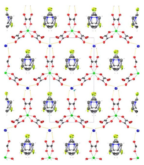 Within each anion layer, the Fe3+ and NH4+ cations are linked by oxalate bridges forming a hexagonal packing arrangement where Fe3+ is octahedrally coordinated by oxalate ligands. Outer oxygens of oxalates form hydrogen bonds with the NH4+ cations (Figure 4). This anionic network forms large hexagonal cavities where halopyridine guest molecules reside. Fe3+ cations and nitrogen of NH4+ cations reside in special positions. There are twofold symmetry axes connecting them.