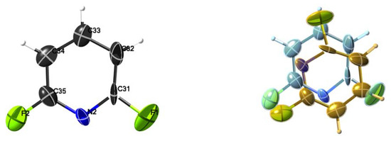 View of the 2,6-DFPy molecule in the crystal structure 5 along the molecular twofold axis (left) and along the lattice twofold axis (−x, y, 1/2 − z) (right). The 2,6-DClPy molecule in the crystal structure 4 is arranged in the same manner.