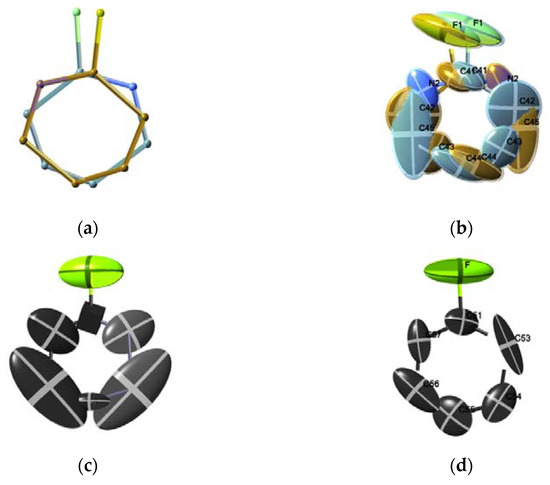 It should be emphasized that, while molecules of 2,6-DFPy and 2,6-DClPy have their own molecular twofold symmetry axes, they still reside in the cavities with the substantial displacement of approximately 0.8 Å with no atoms occupying special positions, resulting in a positional disorder over two positions around the lattice twofold axis (Table 4, Figure 5 and Figure 6). It is most likely a consequence of the requirement to completely fill up the cavity void space by a smaller molecule. However, the larger chlorine-containing 2,6-DClPy is almost 0.1 Å less displaced than the fluorine-containing 2,6-DFPy but requires a larger tilt to be accommodated.
