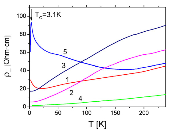 The temperature dependences of the out-of-plane resistivity for the samples 1–5 are presented in Figure 9. All these samples are metals despite the existence of the negative slopes on the low-temperature parts on the ρ⊥(T) curves for the samples 5 and 1. Moreover, the sample 5 demonstrates a sharp resistance drop at low temperature which one can surely attribute to the onset of a superconducting transition at Tc = 3.1 K. Unfortunately, we could not reach the real zero resistance state, even at our minimal temperature 1.4 K, because the superconducting transition is not very narrow. This is typical for organic metals, for which the transition width is usually more or about 2 K. The behavior of the sample 1 at T < 20 K is similar to that of the sample 5, so we do not exclude the possibility that this sample could also be a superconductor at temperatures below 1 K, but we could not check this statement because our temperature region was restricted by 1.4 K.