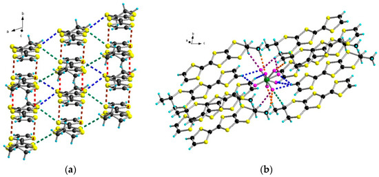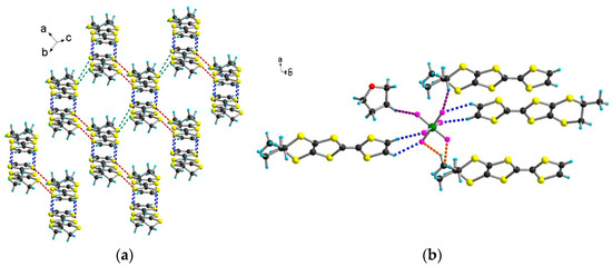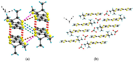 (a) Packing of the donors in the structure of [(S)-1]AsF6·C4H8O with emphasis on the S···S short contacts: blue dotted lines for (3.33–3.37 Å), red dotted lines for (3.59–3.66 Å), green dotted lines for (3.75–3.77 Å); (b) View of the structure of [(S)-1]AsF6·C4H8O with an emphasis on the C–H···F short contacts: blue dotted lines for CHvinyl (2.41–2.64 Å), orange dotted lines for Me (2.59–2.62 Å), violet dotted lines for CH2 and CH (2.64–2.65 Å).