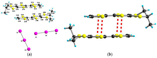 (a) Molecular structure of [(S)-1]I3 together with the atom numbering scheme; (b) Dimer motif in the structure of [(S)-1]I3 with emphasis on the S···S short contacts: red dotted lines for 3.34, 3.37, 3.38 and 3.42 Å.