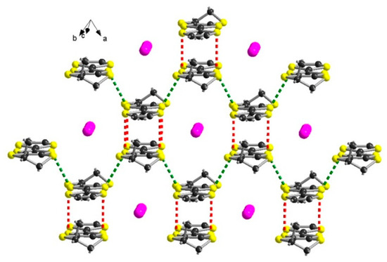 The donors A and B are strongly dimerized as attested by the eclipsed arrangement and the very short intradimer S···S distances ranging between 3.34 and 3.42 Å (Figure 6b for [(S)-1]I3). The packing of the donors is strongly reminiscent of the one observed in the structure of (EDT-TTF)I3 [24]. Accordingly, one I3 anion separates the layers of donors, and the other I3 anion is embedded in the layer, with its axis parallel to the long axis of the donors, thus leading to only lateral overlap between the dimers (Figure 7 for [(R)-1]I3).