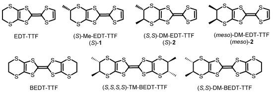EDT-TTF, Me-EDT-TTF (1), DM-EDT-TTF (2), BEDT-TTF, TM-BEDT-TTF and DM-BEDT-TTF donors. Specifically, 1 and 2 were used in the present study. Only the (S) enantiomers for 1 and 2 together with the (meso) form of 2 are represented.