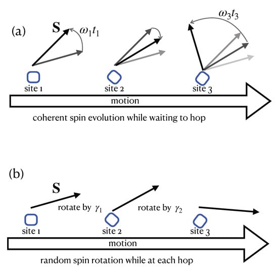 Information from muon spectroscopy is obtained from the measured polarization of the implanted muons. For static fields, stationary muon spins experience a distribution of environmental magnetic fields whose ensemble average yields the measured response. When muons diffuse throughout the host, the fields fluctuate, which alters the spin decay function of the ensemble [24]. Calculations of the polarization in time yield information on the fields, as well as the hopping diffusion of the muons. Figure 1a shows how the classical spin rotation is coherent at each location, but then abruptly changes when an incoherent hop occurs; at the new location, the evolution is again coherent, and the process repeats until the spin polarization decays to zero. Since the spin is rotated while situated at a site, we call this an intrasite process of spin relaxation. The intersite process involves the spin rotating during the hopping process itself, while the spin is stationary when sitting on a site. Intrasite processes dominate the polarization functions of muon spectroscopy and therefore have been well studied for many decades [19,28,29]. Previous studies have shown that quantum and classical calculations of spin diffusion length agree well [8,30]. The time to hop, , varies widely from system to system. As discussed later, the time is strongly dependent on energetic disorder. Times can be as short as femtoseconds [31].