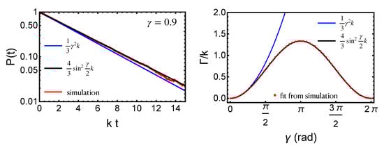 With the strong-collision approximation, the theory of continuous-time random walks [39,40] can be used to calculate the polarization functions of hopping carrier spins. Two important functions of continuous-time random walk theory are the survival probability, , and the wait time distribution, . is the probability that a random walker starting on a site at has not hopped by time t. is the probability distribution from which the hopping times are chosen. The two quantities are related by: