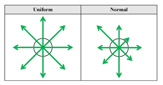 (Color online) Spin randomizing field vector (green arrows) directions are random at each step; two models of their magnitudes are used: either a constant magnitude (uniform) or a magnitude from a Gaussian distribution (normal).
