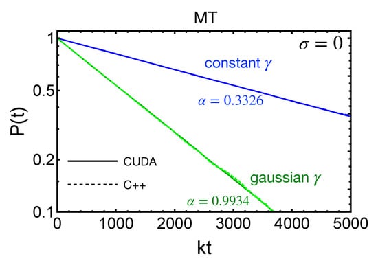 (Color online) Polarization functions in the MT model with the zero disorder parameter, , for two different models of the local fields, : constant magnitudes (blue) and Gaussian magnitudes (green). The spin relaxation rate fit constants, , are given for each (see Equation (24)). The values agree well with the theoretical values of 1/3 and 1. Two simulations were compared-: one programmed serially in C++ and the other in parallel with CUDA. Their differences are nearly imperceptible (the difference between solid and dashed lines). Additional parameters used in the simulations were (for the Gaussian approximation , it is the width of the distribution) and . The C++ (CUDA) simulation is averaged over 20 k(200 k) configurations.