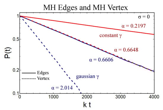 (Color online) Polarization functions in the MH model with the zero disorder parameter, , for two different models of the local field magnitudes, : constant magnitudes (red) and Gaussian magnitudes (blue). Solid lines use the edges version, while dashed lines use the vertex version. The spin relaxation rate fit constants, , are given for each (see Equation (24)). Additional parameters used in the simulations are (for the Gaussian approximation, is the width of the distribution) and .