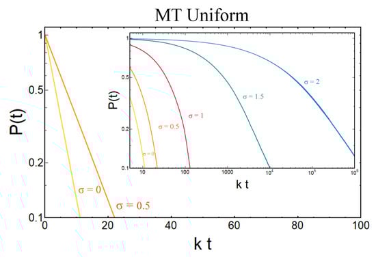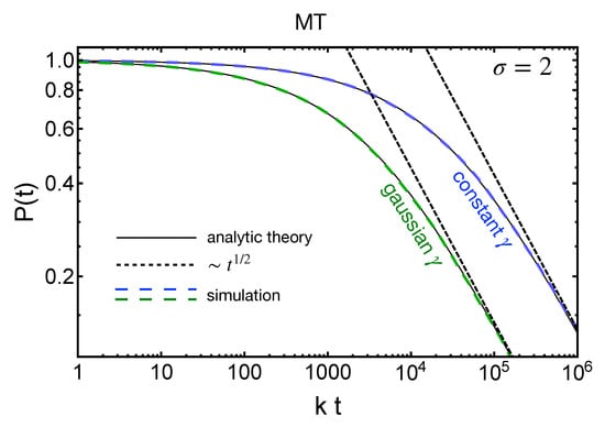 Figure 8, Figure 9 and Figure 10 demonstrate the role nonzero disorder () plays in the spin polarization functions. Figure 8 is the MT model with . The thin black lines are the analytic results from inverse Laplace transforms of Equation (20). The linear dashed lines are the analytic approximation at longer times given by Equation (22). The key features, when , are that the polarization function decays algebraically at long times no matter the model being used (however, an exponential density of states was assumed here).