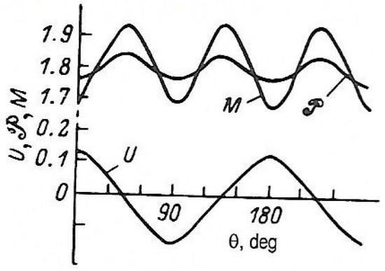 Dependence of the uniform polarization P, strain U, and magnetic moment M upon the angle between the external magnetic field and the crystal axis [100] in the antiferroelastic phase [20,21].
