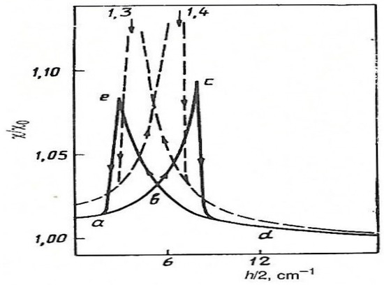 In the ordered state of the DyVO4 crystal, each unit cell has two antiparallel electric dipole moments dI and dII oriented along the crystal c-axis. Clearly, if the magnetic field changes the sign of the crystal strain, the field-induced inversion of the elastic dipoles is, at the same time, the inversion of the electric dipole moments of both sublattices. Thus, a phase transition of the antiferroelectric-type takes place [23]. The influence of the magnetic field on the dielectric susceptibility at such a transition is shown in Figure 3. The variation of χ corresponds to curve abcd in an increasing magnetic field and to curve dbea in a decreasing field. If the field varies sufficiently slowly, hysteresis does not occur, and the behavior of χ(H) is described by curve abcd. It should be noted that, in this case, the magnitude of the anomaly is smaller than in transitions from metastable states, but still noticeable (≈8%).