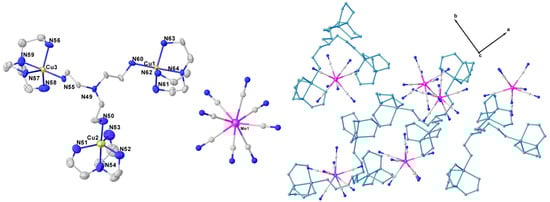 The [{Cu(tren)}3(μ-tren)]6+ is constructed by one μ-tren linked to three Cu sites, where each copper site is blocked by another tren ligand. Therefore, the tren ligands serve as a tetradentate ligand for the copper sites, and as a tridentate ligand to link the three different Cu sites contained in the trimetallic cation. To the best of our knowledge, this unusual trinuclear copper complex cation has been reported only in the crystal structure of [Cu3(tren)4][Pt(CN)4]3·2H2O []. As indicated by the continuous shape measurement (CShM) [] values, all the copper sites adopt triangular bipyramidal geometry, with the exception of Cu9 site which corresponds to distorted square pyramidal geometry, in agreement with the UV-Visible spectra (see Table A2). For instance, the CShM value for Cu1 site is 0.420, corresponding to the triangular bipyramidal geometry and for Cu9 site is 1.491, corresponding to the square pyramidal geometry. The three copper sites in [{Cu(tren)}3(μ-tren)]6+ are arranged in the form of an irregular triangle, for example, with rather long Cu...Cu distances, such as as 7.450, 7.542, 9.156 Å for Cu1...Cu2, Cu2...Cu3 and Cu1...Cu3 distances, respectively.