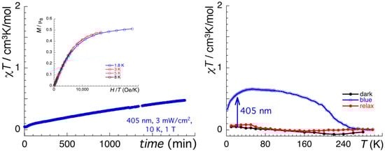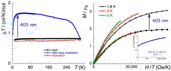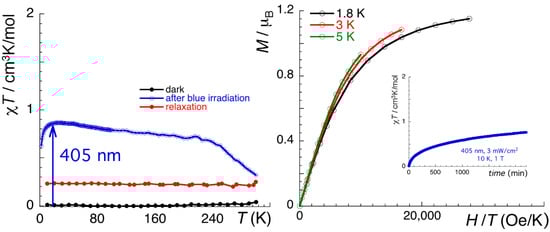 (Left) Time dependence of the χT product measured at 1 T during 405 nm light irradiation (0.3 mW/cm2) (Inset: Reduced magnetizations at different temperatures (1.8 K, 3 K, 5 K and 8 K) in the photo-excited state of 3). (Right) χT = f(T) plots at 1 T and 0.4 K/min of 3 measured in the dark before any light irradiation, after 405 nm irradiation and after reconditioning to 300 K.